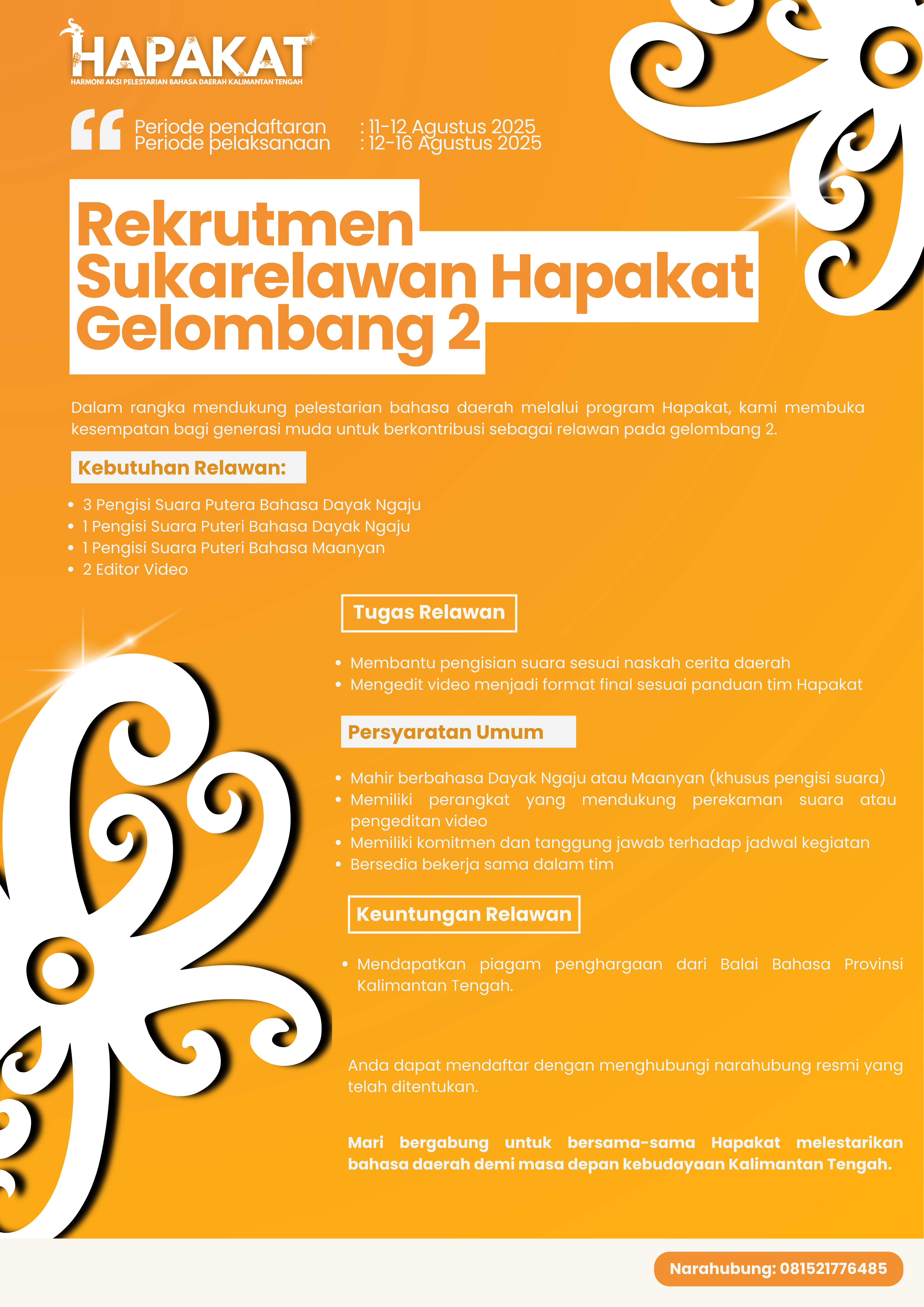 Mari bergabung menjadi relawan Hapakat dan ambil bagian dalam pelestarian bahasa daerah Kalimantan Tengah! Tak hanya sebagai pengisi suara, kamu juga bisa berkontribusi sebagai editor video. Dengan keterampilan dan semangatmu, kita bisa bersama-sama menghidupkan kembali warisan budaya lisan agar terus hidup dan menginspirasi generasi berikutnya.